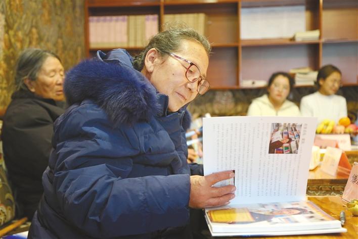 圖為昌都市婦聯(lián)組織老黨員干部查看“70人70事獻(xiàn)禮畫冊(cè)”?! ?/p>