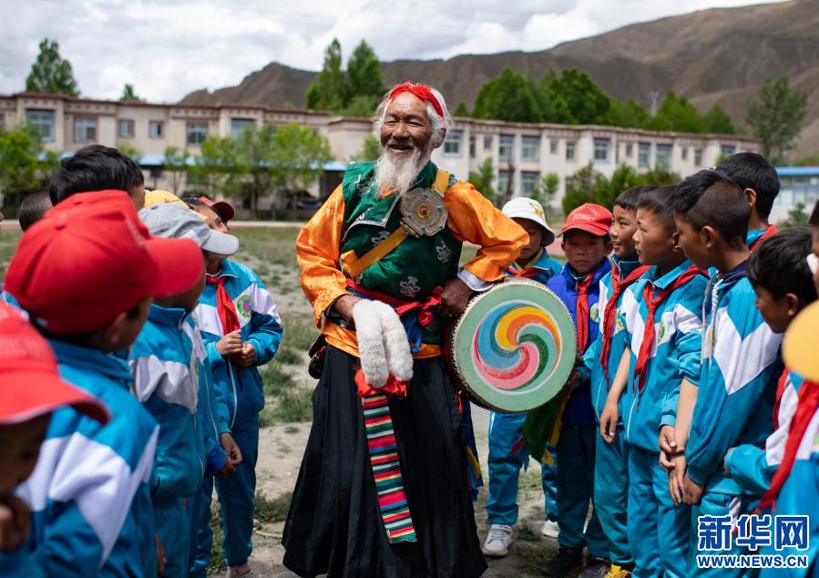 “久河卓舞”傳承人尼瑪(中)在瓊結(jié)縣下水鄉(xiāng)小學(xué)進(jìn)行教學(xué)表演前的準(zhǔn)備工作(2020年7月2日攝)。新華社記者 普布扎西 攝