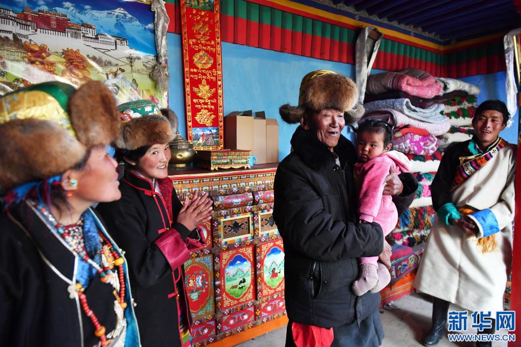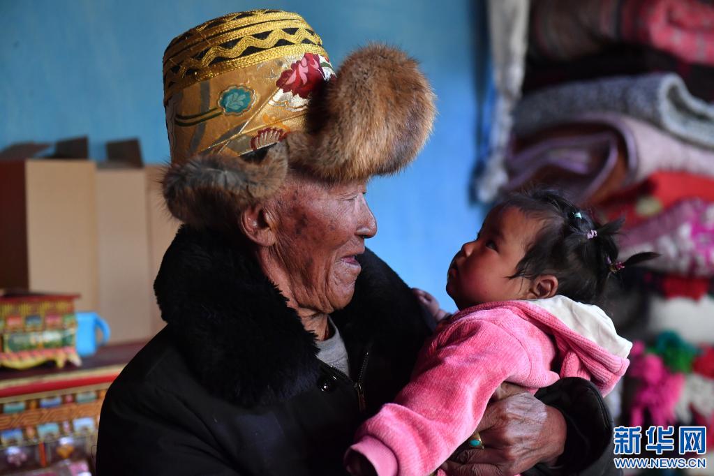 巴桑和九個(gè)月大的重外孫女白瑪色珍在一起(3月21日攝)。新華社記者 孫瑞博 攝