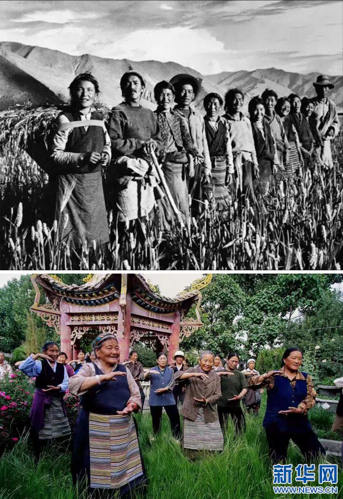 拼版照片:上圖:次仁拉姆(左一)和互助組成員在田間勞作(資料照片)。下圖:次仁拉姆(左前)在社區(qū)居委會里學習太極拳(新華社發(fā) 車剛 攝)新華社發(fā)