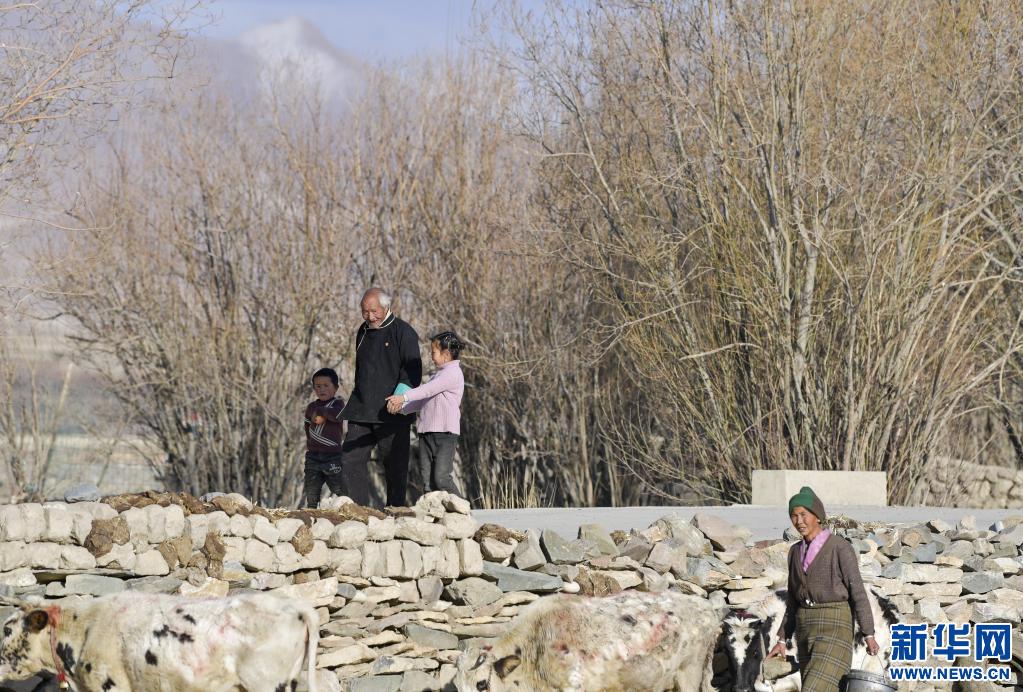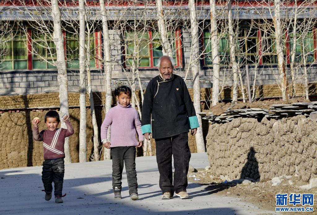達國杰和孫子孫女在村子里散步(3月22日攝)。新華社記者 張汝鋒 攝