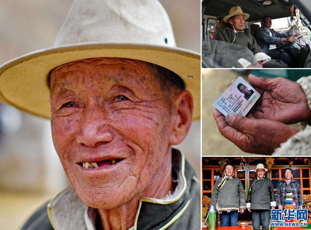 這是一張拼版照片,左圖為多扎木的肖像(3月20日新華社記者張汝鋒攝);右上圖為多扎木和兒子準備坐車外出(3月20日新華社記者孫瑞博攝);右中圖為多扎木老人的身份證(3月20日新華社記者孫瑞博攝);右下圖為多扎木(中)和兒子、兒媳在家中(3月20日新華社記者張汝鋒攝)。新華社發(fā)