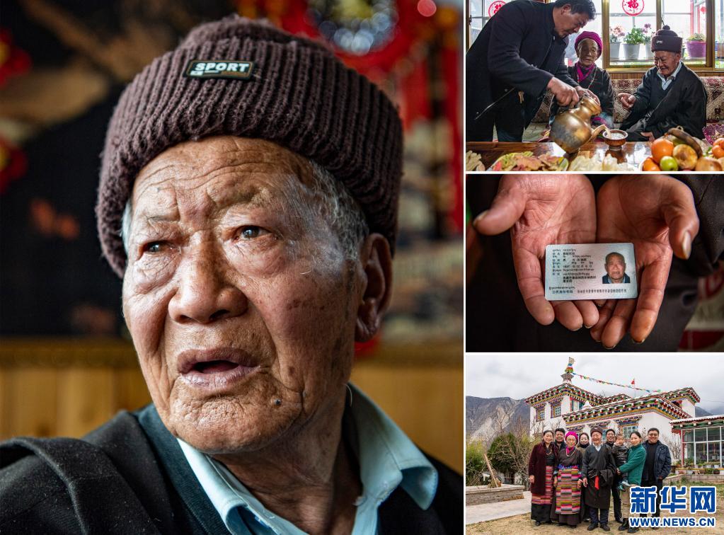 這是一張拼版照片,左圖為邊巴倉決的肖像(3月19日新華社記者張汝鋒攝);右上圖為邊巴倉決(左二)和鄰居在家里拉家常(3月19日新華社記者孫瑞博攝);右中圖為邊巴倉決的身份證(3月19日新華社記者孫瑞博攝);右下圖為邊巴倉決和孫子孫媳在一起(3月19日新華社記者張汝鋒攝)。新華社發(fā)