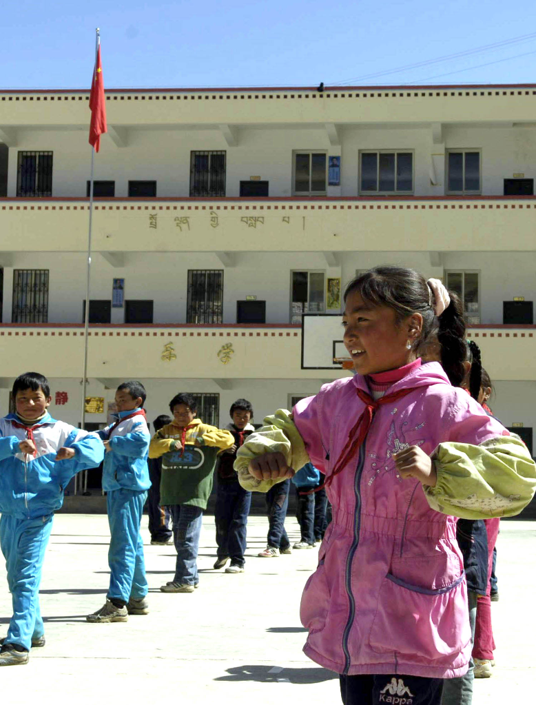 2008年4月16日,四川省阿壩藏族羌族自治州壤塘縣南木達(dá)易地育人學(xué)校的學(xué)生在上體育課。 新華社記者海明威 攝