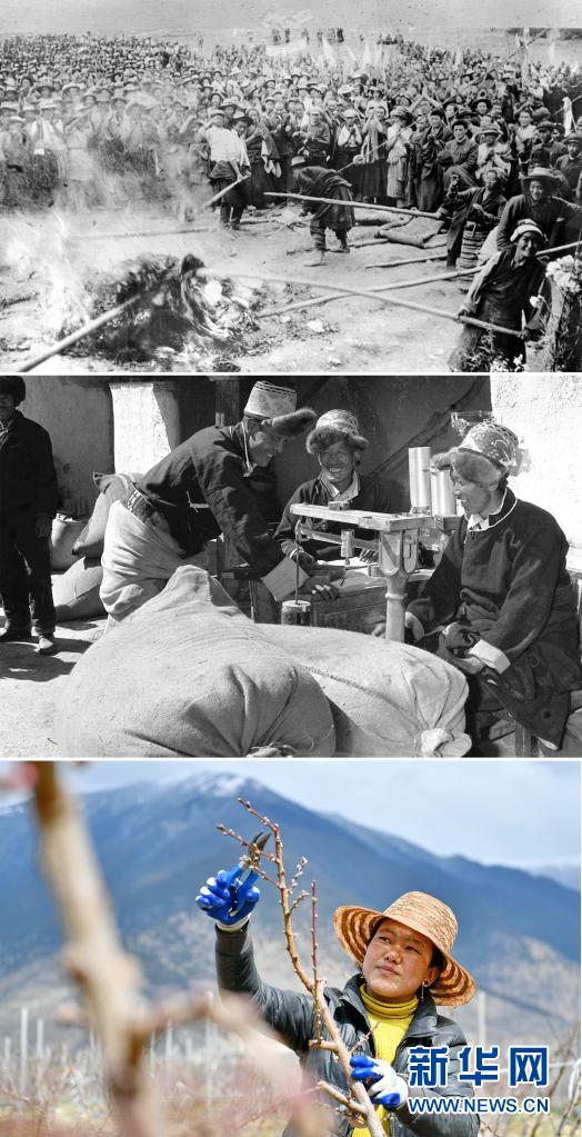 這是一張拼版照片:上圖為1959年8月,西藏墨竹工卡縣的翻身農(nóng)奴焚燒三大領(lǐng)主的剝削文契(新華社發(fā));中圖為1984年,江孜縣農(nóng)民洛桑旺堆(左)向國家出售余糧。他家承包土地100多畝,農(nóng)忙種地,農(nóng)閑搞建筑、跑運輸(新華社記者土登攝);下圖為2020年3月22日,西藏林芝現(xiàn)代蘋果標(biāo)準(zhǔn)化示范園的工作人員為桃樹剪枝。該示范園實施農(nóng)機農(nóng)藝結(jié)合、水肥一體化及“果草畜循環(huán)”,大面積推廣蘋果矮砧集約高效栽培技術(shù),帶動米林縣羌納鄉(xiāng)林巴、才巴、色沃村及附近的農(nóng)戶增收(新華社記者 張汝鋒 攝)。新華社發(fā)