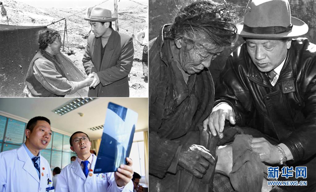 這是一張拼版照片:左上圖為來自陜西的援藏干部阿里日土縣副縣長賈冗勇深入牧區(qū),幫助藏族牧民解決生產(chǎn)、生活的實際困難(新華社記者土登攝 1997年11月11日發(fā));左下圖為2017年8月3日,北京積水潭醫(yī)院援藏醫(yī)生龔曉峰(右)和北京天壇醫(yī)院援藏醫(yī)生李家謀在拉薩市人民醫(yī)院骨科病房內(nèi)查看患者的X光片,進行工作交接(新華社記者晉美多吉攝);右圖為孔繁森(右)在阿里日土縣過巴鄉(xiāng)為孤寡老人益西卓瑪治病(新華社記者土登攝 1994年12月26日發(fā))。新華社發(fā)