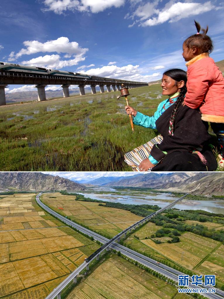 這是一張拼版照片:上圖為西藏當(dāng)雄縣藏族群眾在觀看火車駛過(2006年6月17日 新華社記者覺果攝);下圖為在西藏拉薩市曲水縣拍攝的公路與鐵路(2016年8月17日新華社記者普布扎西攝 無人機照片),西藏已形成了公路、鐵路、航空的立體交通網(wǎng)絡(luò)。新華社發(fā)