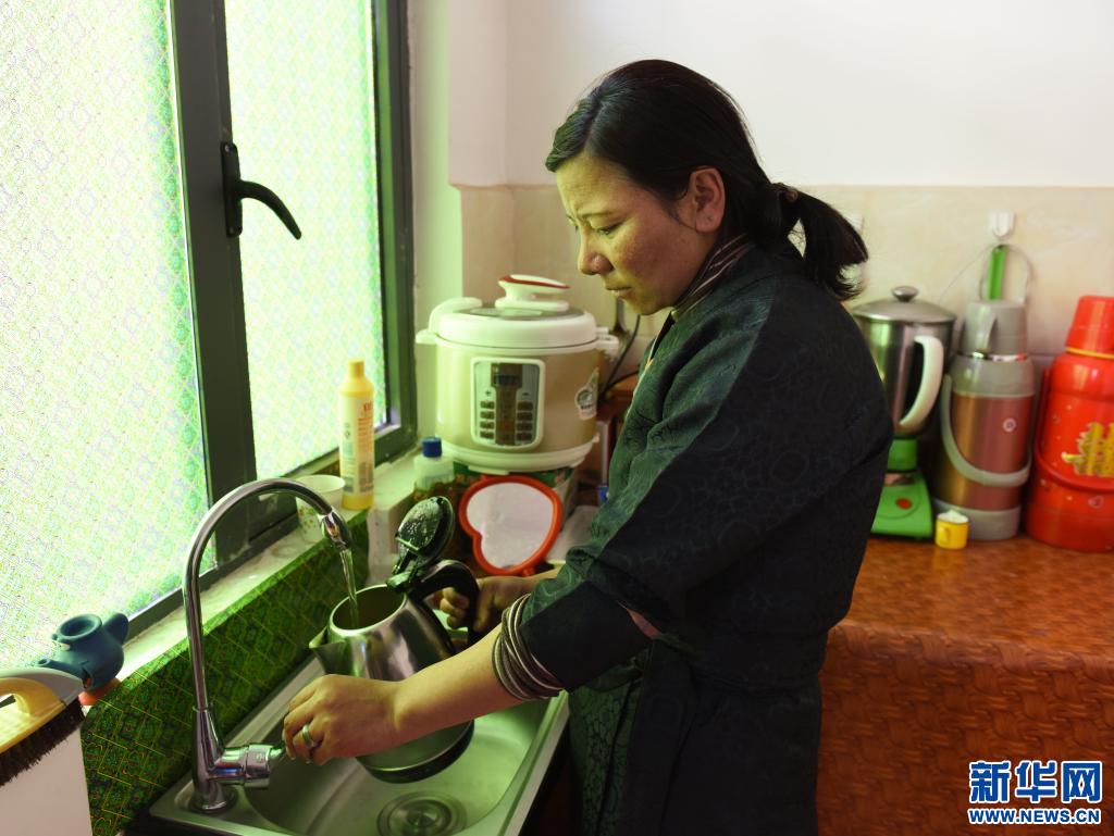森布日極高海拔生態(tài)搬遷安置點(diǎn)內(nèi),村民次仁卓嘎終于在家里用上了自來水(2020年1月12日攝)。新華社記者 田金文 攝