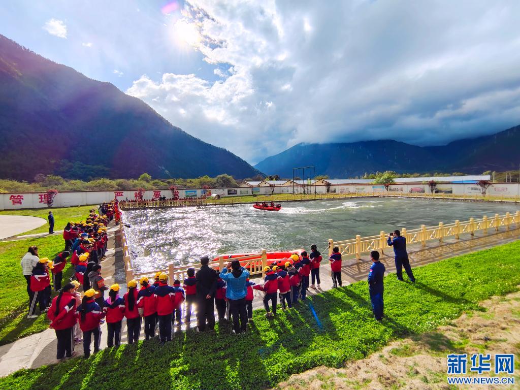 米林縣森林消防中隊向參觀師生演示水域救援流程。李銀初攝