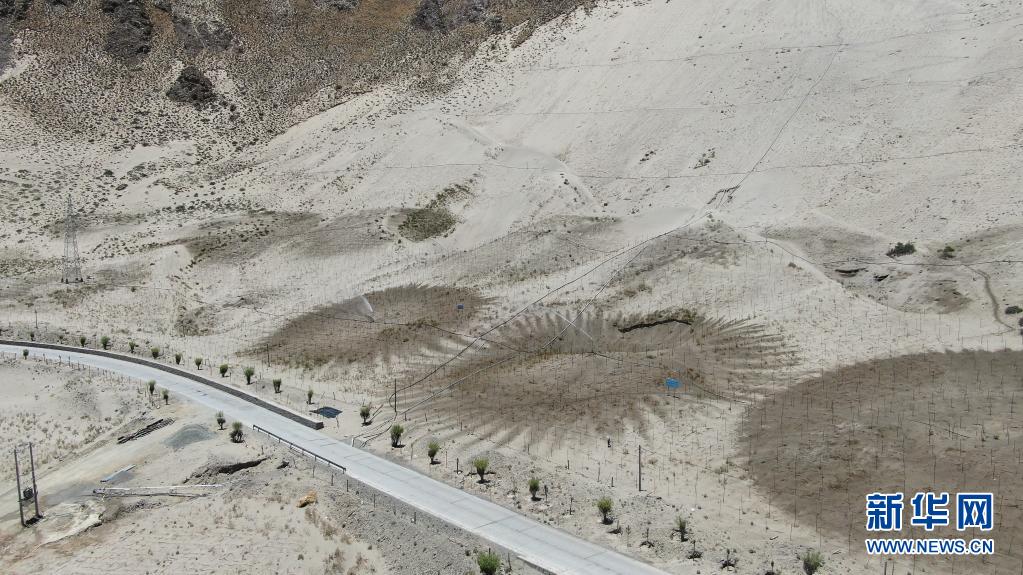 在山南市雅魯藏布江河谷地帶,村民們在維護固沙用的草方格(2019年7月14日攝)。新華社發(fā)(資料照片)