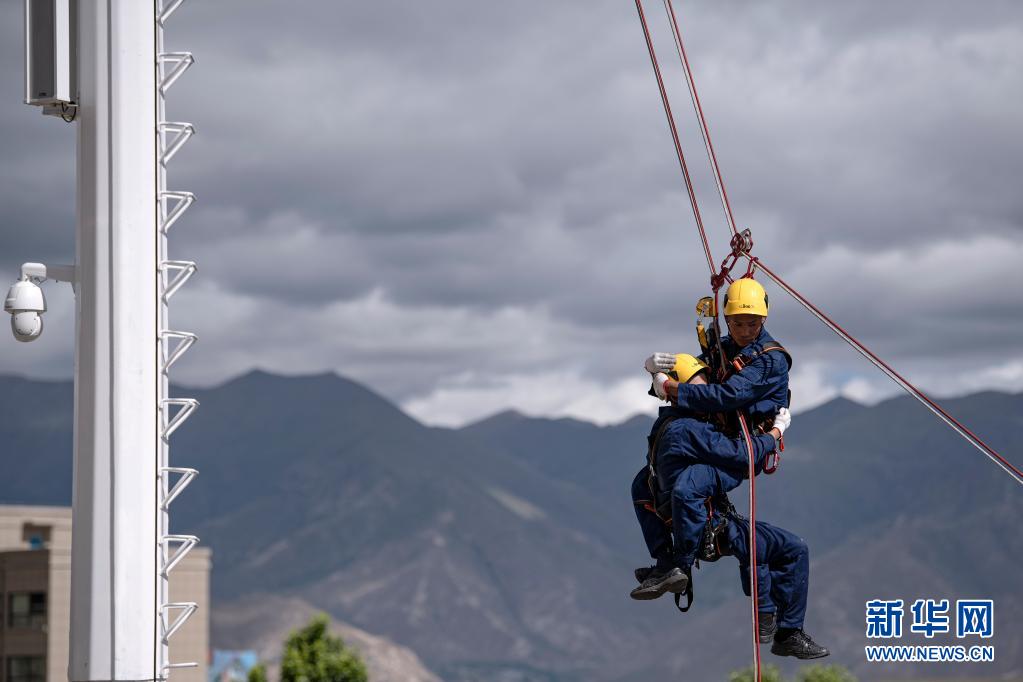 6月15日,參訓(xùn)學(xué)員進(jìn)行鐵塔救援系統(tǒng)實(shí)際操作展示。新華社記者 孫瑞博 攝