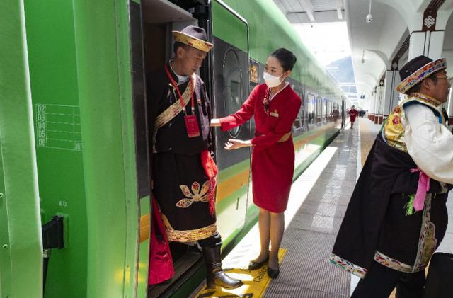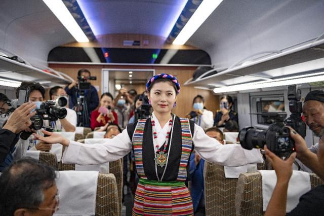 西藏首列復(fù)興號(hào)的列車(chē)員在進(jìn)行當(dāng)?shù)胤棻硌?6月25日攝)。 新華社記者 普布扎西 攝
