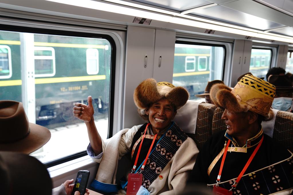 6月25日,群眾代表乘坐拉林鐵路動車組首發(fā)車。新華社記者 劉洪明 攝