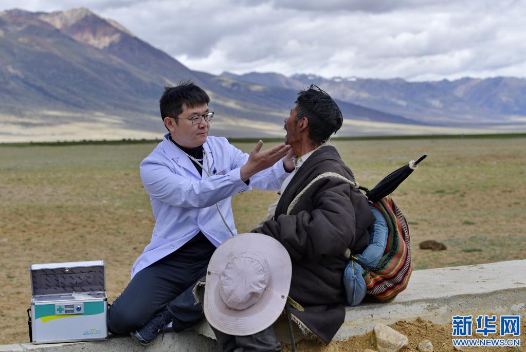 王克明(左)在西藏當(dāng)雄縣格達(dá)鄉(xiāng)格達(dá)村牧場為牧民義診(6月19日攝)。新華社記者 張汝鋒 攝