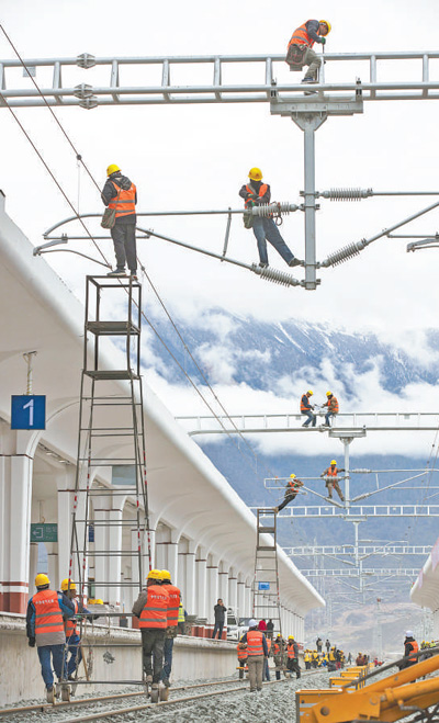 4月1日,中鐵電氣化局集團(tuán)技術(shù)工人在林芝火車(chē)站進(jìn)行接觸網(wǎng)精調(diào)作業(yè)。焦宏濤攝(新華社發(fā))