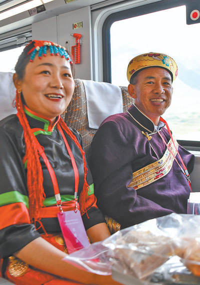 6月25日10時(shí)30分,一輛復(fù)興號(hào)高原內(nèi)電雙源動(dòng)車(chē)組駛出拉薩火車(chē)站,駛向林芝市。圖為乘坐復(fù)興號(hào)的乘客。新華社記者 晉美多吉攝