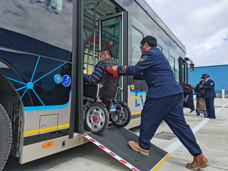 3日,拉薩市公交運營有限公司舉行拉薩公交經(jīng)開區(qū)B區(qū)公交首末站啟用暨大站快線開通儀式?,F(xiàn)場,坐在輪椅上的市民覺列準(zhǔn)備乘坐新公交車,駕駛員接到乘車提示后,采取制動措施,將車輛熄火后來到后門處,將無障礙踏板翻開并固定好,順利幫其上車。