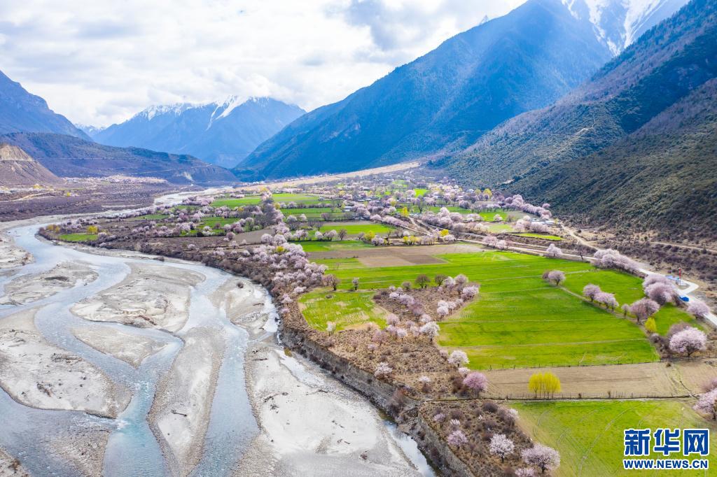 西藏林芝市波密縣境內(nèi)桃花盛開的田園風(fēng)光(2020年3月26日攝,無人機照片)。新華社記者普布扎西 攝