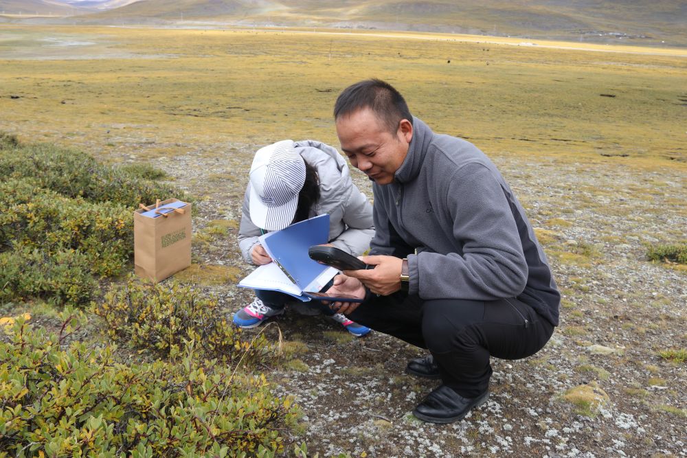郝偉(右)和團隊工作人員在野外采集植物樣本數(shù)據(jù)。受訪者供圖