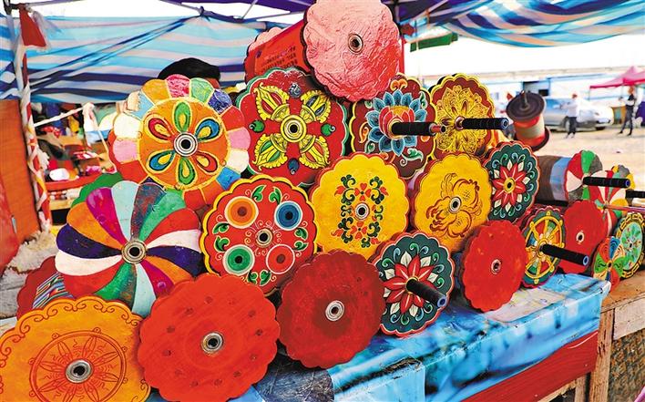 線軸也是藏式斗風(fēng)箏時(shí)的重要武器。線軸,藏語(yǔ)稱(chēng)為“擴(kuò)羅”,是用幾根小圓木和兩個(gè)等圓的木板做成的,像個(gè)車(chē)輪,有軸心和軸桿,線就繞在輪軸上。線軸有大小之分,線軸越大,收放線的速度越快。參賽者根據(jù)自己的年齡大小、手掌大小、風(fēng)箏大小以及風(fēng)力大小等因素來(lái)選擇線軸,只有當(dāng)線軸大小與實(shí)際情況相匹配,操作起來(lái)才得心應(yīng)手。