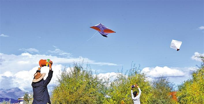 每年金秋時(shí)節(jié),在拉薩城的上空,便會(huì)出現(xiàn)千百只風(fēng)箏漫天飛舞、爭(zhēng)奇斗艷的景觀。在碧藍(lán)的天空下,那些形狀各異、如鷹似燕的風(fēng)箏,時(shí)而高飛、時(shí)而低落、時(shí)而旋轉(zhuǎn)、時(shí)而打斗,一旁觀戰(zhàn)或正在放風(fēng)箏的人仰頭觀看,歡呼聲、嘆息聲、助威聲此起彼伏,很是熱鬧。