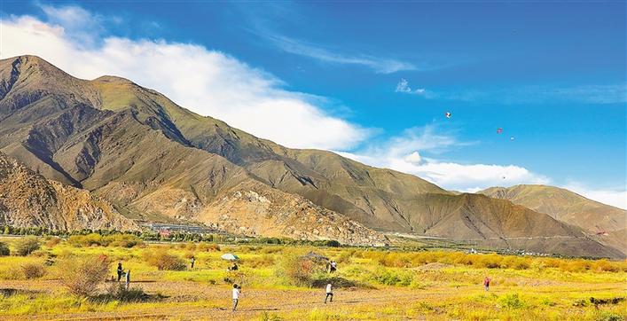 圖為市民在拉薩河畔放風(fēng)箏。