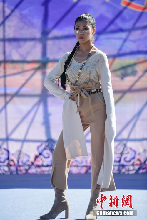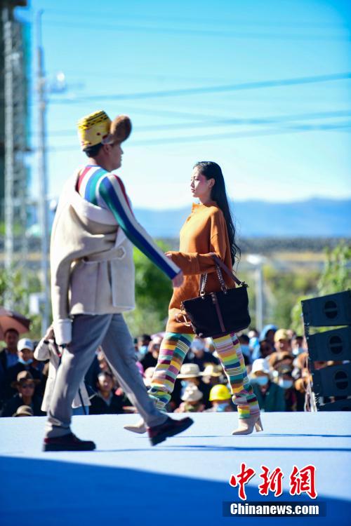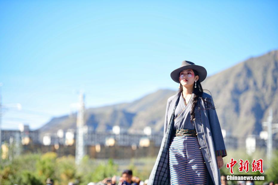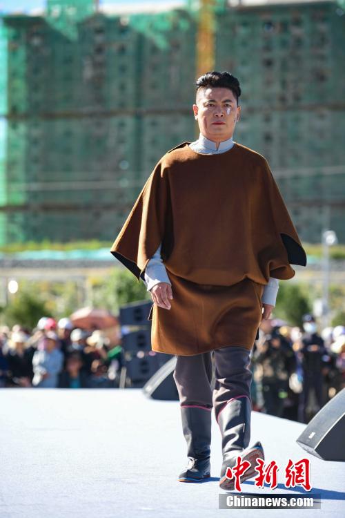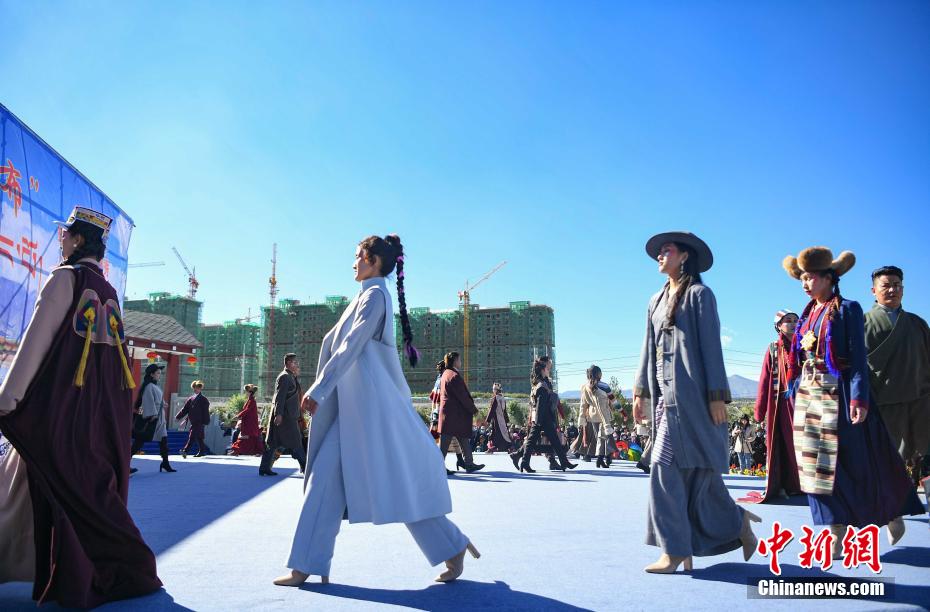 圖為當(dāng)?shù)夭刈迥L厣碇把鹏敳夭肌爆F(xiàn)代藏裝服飾進(jìn)行走秀。貢嘎來松 攝