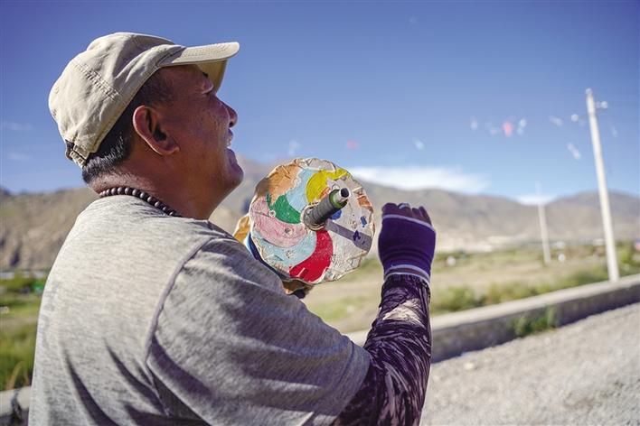 近日,記者來到位于江蘇實驗中學附近的拉薩河畔,這里聚集著不少賣風箏的小攤,旁邊也有很多放風箏的人。風箏在拉薩稱為“洽皮”,而在日喀則被稱為“秀洽”。西藏風箏最大的特色在于“斗風箏”,勝負取決于風箏絞線的質(zhì)量和風箏愛好者的放飛技巧。