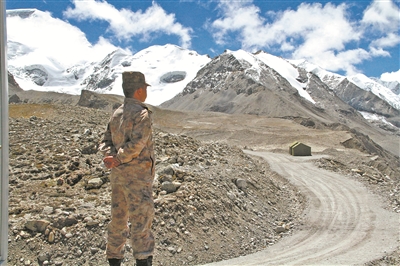 執(zhí)勤崗哨位于一片空地,遠(yuǎn)處是連綿雪山,再遠(yuǎn)一點(diǎn)的地方便是官兵每天凝視的邊防線。