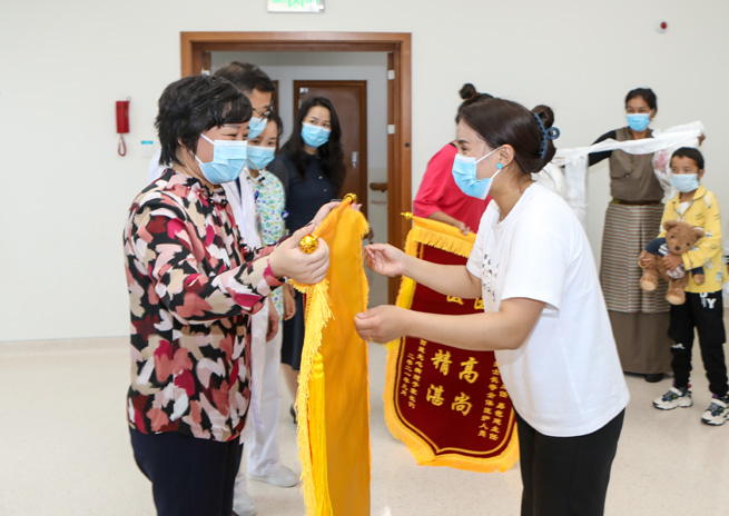 鄧?yán)蚋敝魅我恍锌赐藖?lái)渝治療的15位患兒,并為他們送上嶄新的書(shū)包和文具。并與患兒家長(zhǎng)熱情交談,詳細(xì)了解患兒恢復(fù)情況?;純杭覍俅碜楷敽屯贩謩e向重慶市衛(wèi)健委和重醫(yī)附屬兒童醫(yī)院贈(zèng)送了錦旗,并獻(xiàn)上了潔白的哈達(dá)表示感謝。