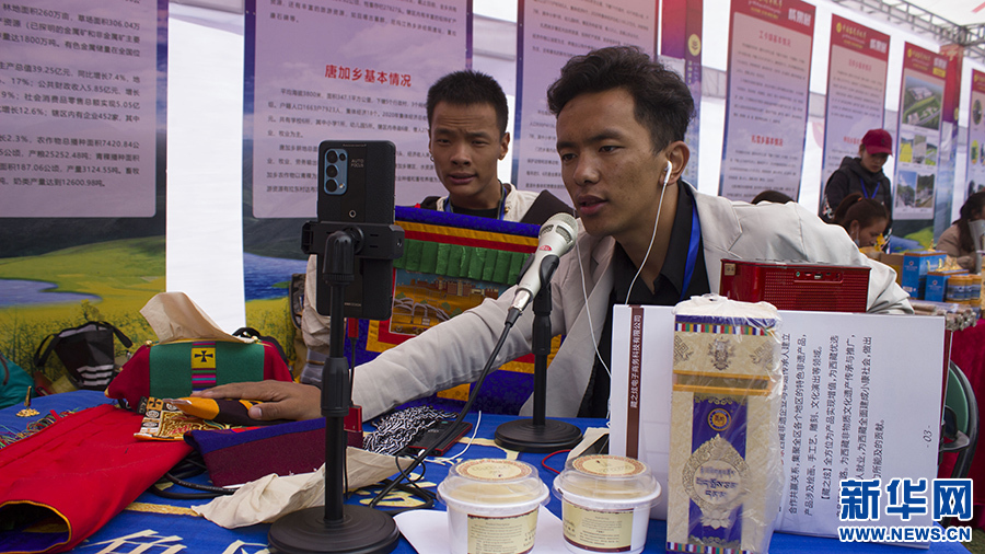 圖為在農(nóng)產(chǎn)品展銷(xiāo)區(qū)直播帶貨的展銷(xiāo)人員(9月23日攝)。新華網(wǎng) 達(dá)次 攝