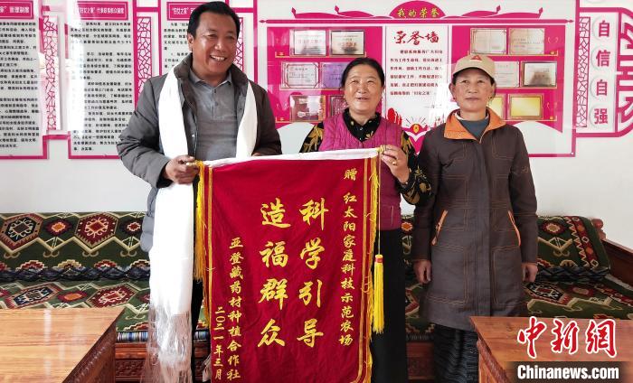 圖為基層合作社負(fù)責(zé)人向米林家庭農(nóng)場(chǎng)贈(zèng)送錦旗。平措旺青供圖
