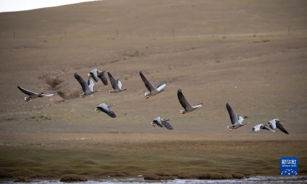 這是9月24日在羌塘國(guó)家級(jí)自然保護(hù)區(qū)拍攝的飛翔的斑頭雁。新華社記者 晉美多吉 攝