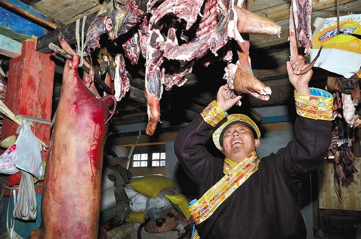 林芝市米林縣羌納鄉(xiāng)結(jié)果村村民旺杰在查看風干肉晾制情況。王雅慧 攝