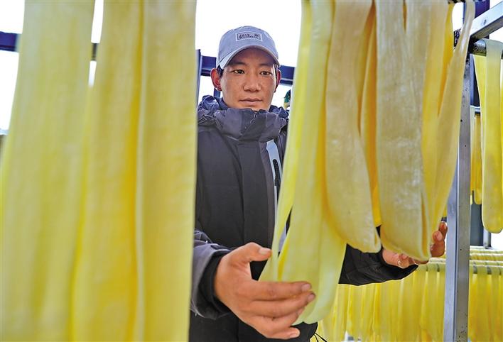 那曲市噶爾德生態(tài)畜牧業(yè)發(fā)展有限公司員工正在晾曬奶制品“拉拉”。丹增群培 唐斌 攝