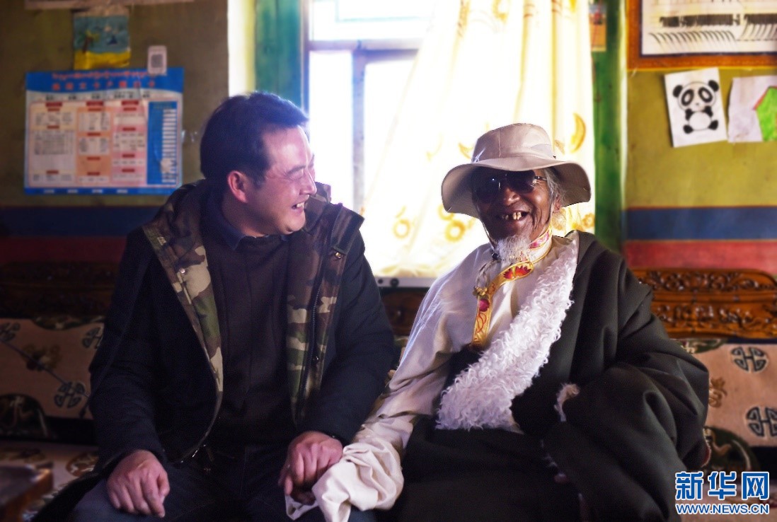10月30日,邱學(xué)彥在跟村民扎塔老人聊天。新華網(wǎng) 旦增努布 攝