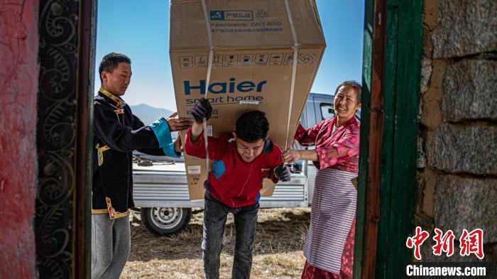 圖為京東配送員給定日縣城消費(fèi)者提供大件家電送貨上門服務(wù)。資料圖 劉暢 攝