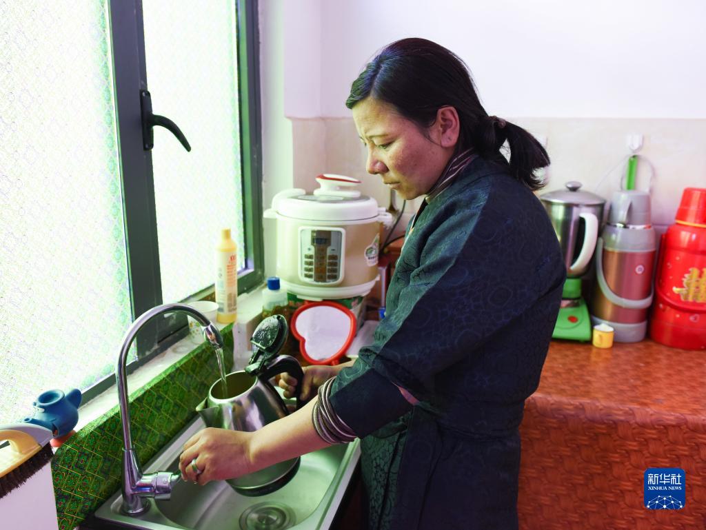 西藏山南市貢嘎縣森布日極高海拔生態(tài)搬遷安置點(diǎn)內(nèi),村民次仁卓嘎在家里用上了自來(lái)水。(2020年1月12日攝)。新華社記者 田金文 攝