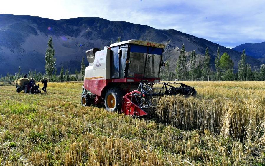 山南市扎囊縣松卡居委會(huì)的居民在收割青稞(2019年8月29日攝)。新華社記者 張汝鋒 攝