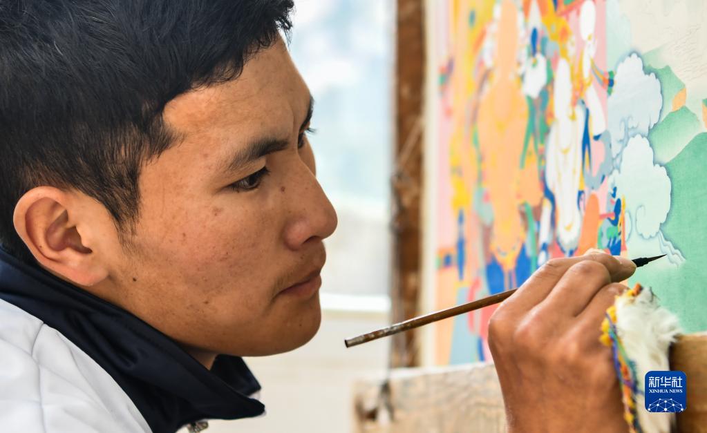 在西藏昌都市卡若區(qū)嘎瑪鄉(xiāng)民族手工藝培訓(xùn)基地,學(xué)員正在學(xué)習(xí)唐卡繪畫(huà)。(2019年10月3日攝)新華社記者晉美多吉 攝