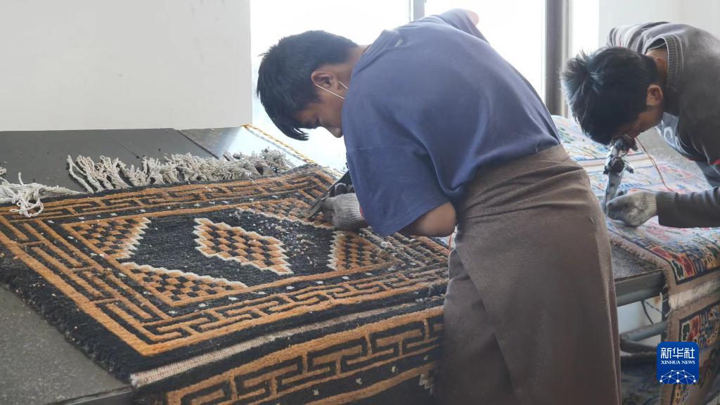 江孜昵煒藏毯廠(chǎng)工人正在對(duì)卡墊進(jìn)行修剪。(2021年10月29日)新華社記者洛卓加措 攝