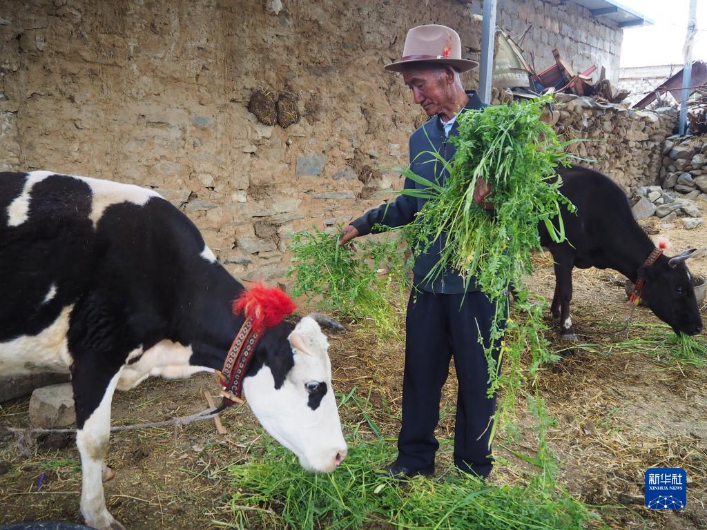 小多列老人在喂奶牛(6月23日攝)。新華社記者 金一清 攝