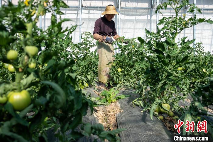 圖為28日,白朗中農(nóng)圣域農(nóng)牧科技有限公司工作人員在為大棚番茄授粉。江飛波 攝