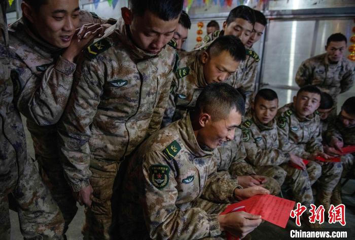 聯(lián)歡的尾聲指導(dǎo)員夏邦國(guó)拿著最后的彩袋走到臺(tái)前,把晚會(huì)推向高潮,“兄弟們,這還有一大袋紅包,里面裝著的可是最珍貴的祝?!?。官兵們用抽盲盒的形式拆開新年的“紅包”。中士趙路寬抽到一個(gè)最鼓的,打開是滿滿的糖果;下士吳兵拆開的是一個(gè)帶有小機(jī)關(guān)的新年賀卡;下士鄧云川拆到一封遠(yuǎn)方的匿名信,“雖不曾相見與相識(shí),但知道是你們?cè)谀瑘?jiān)守付出,守衛(wèi)著祖國(guó)的雪域邊防”。伴隨著他磕絆的普通話,連隊(duì)官兵漸漸安靜下來?!斑呹P(guān)有我,請(qǐng)祖國(guó)和人民放心”,簡(jiǎn)易投影的大屏上開始播放著官兵們一年多來頂風(fēng)冒雪,戰(zhàn)天斗地的光影片段,在這大山里的多少的苦累酸甜,都已經(jīng)鐫刻在茫茫雪域。