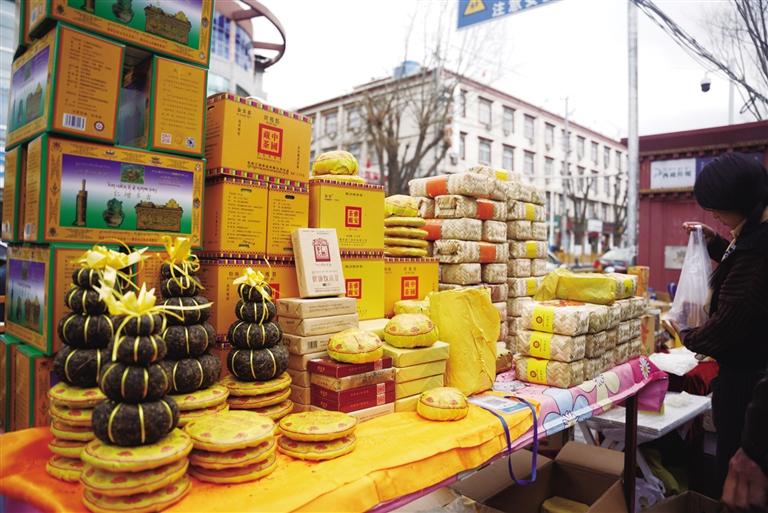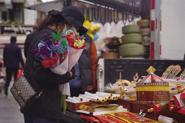 千門萬戶曈曈日,總把新桃換舊符。隨著各民族交往交流交融,藏文對(duì)聯(lián)也逐漸成為藏歷新年年貨市場中不可缺少的“成員”,寄托了人們對(duì)來年美好生活的殷切期盼。走進(jìn)沖賽康市場,記者看到很多攤位都擺放著各式各樣紅色藏式對(duì)聯(lián),內(nèi)容主要蘊(yùn)含平安、健康、長壽等吉祥的寓意,不時(shí)還有市民前來詢價(jià)選購。此外,每年藏歷新年前,不少書法家還會(huì)將滿載祝福的對(duì)聯(lián)寫好后送給市民,把濃濃的年味和對(duì)藏歷新年的祝福送到大家手中。