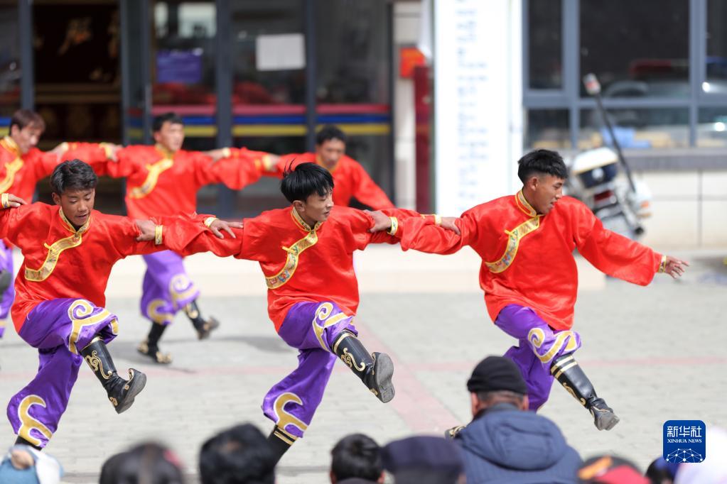 搬遷牧民在搬遷點廣場上跳起民族舞蹈,迎接藏歷新年(2月28日攝)。新華社記者 覺果 攝