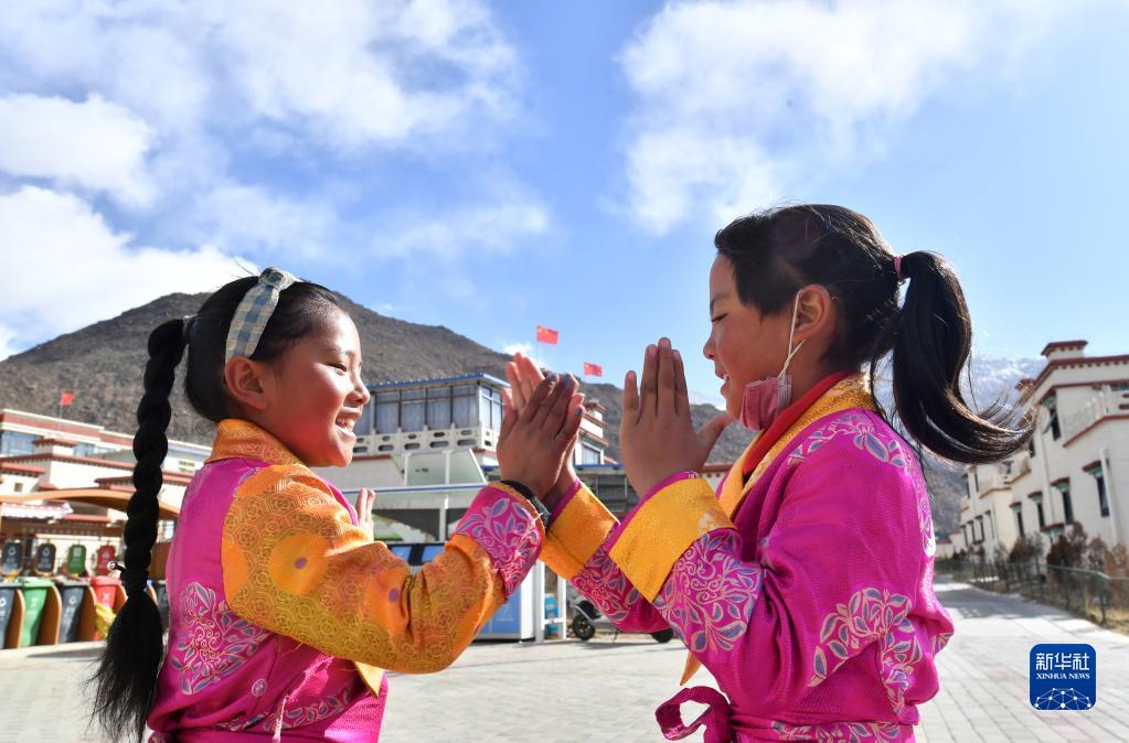 兩位搬遷牧民家的小姑娘穿上盛裝,在榮瑪高海拔生態(tài)搬遷點做游戲(2月28日攝)。新華社記者 覺果 攝