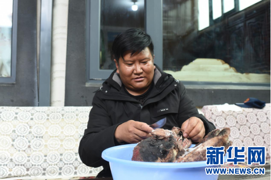 2月27日,在榮瑪鄉(xiāng)高海拔生態(tài)搬遷點村民達(dá)娃次仁在清洗羊頭。新華網(wǎng) 旦增努布 攝