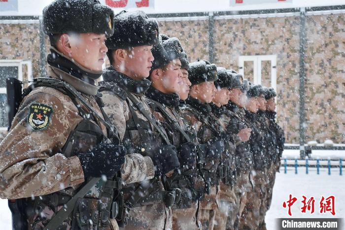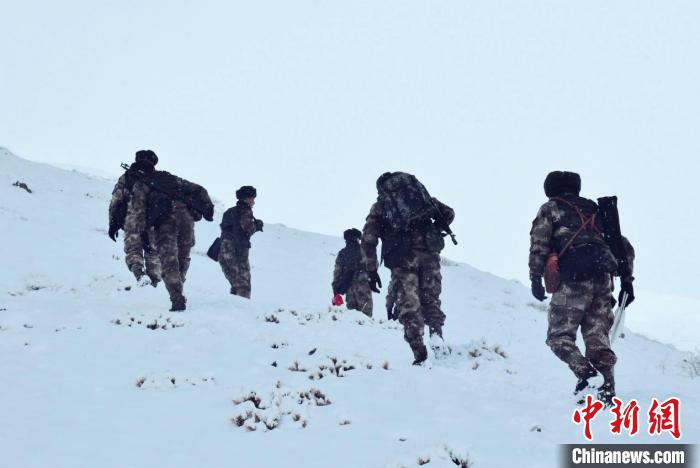 由于道路積雪較厚,車輛無法通行。官兵們采取徒步方式向點(diǎn)位前行,巡邏分隊(duì)在風(fēng)雪中艱難前行,隨著海拔的逐漸增加,氧氣愈發(fā)稀薄,此時(shí)的氣溫已經(jīng)接近零下30攝氏度。