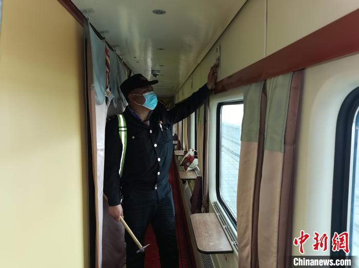 資料圖為嘎瑪達(dá)吉對(duì)列車服務(wù)設(shè)施進(jìn)行檢查。青藏集團(tuán)公司供圖